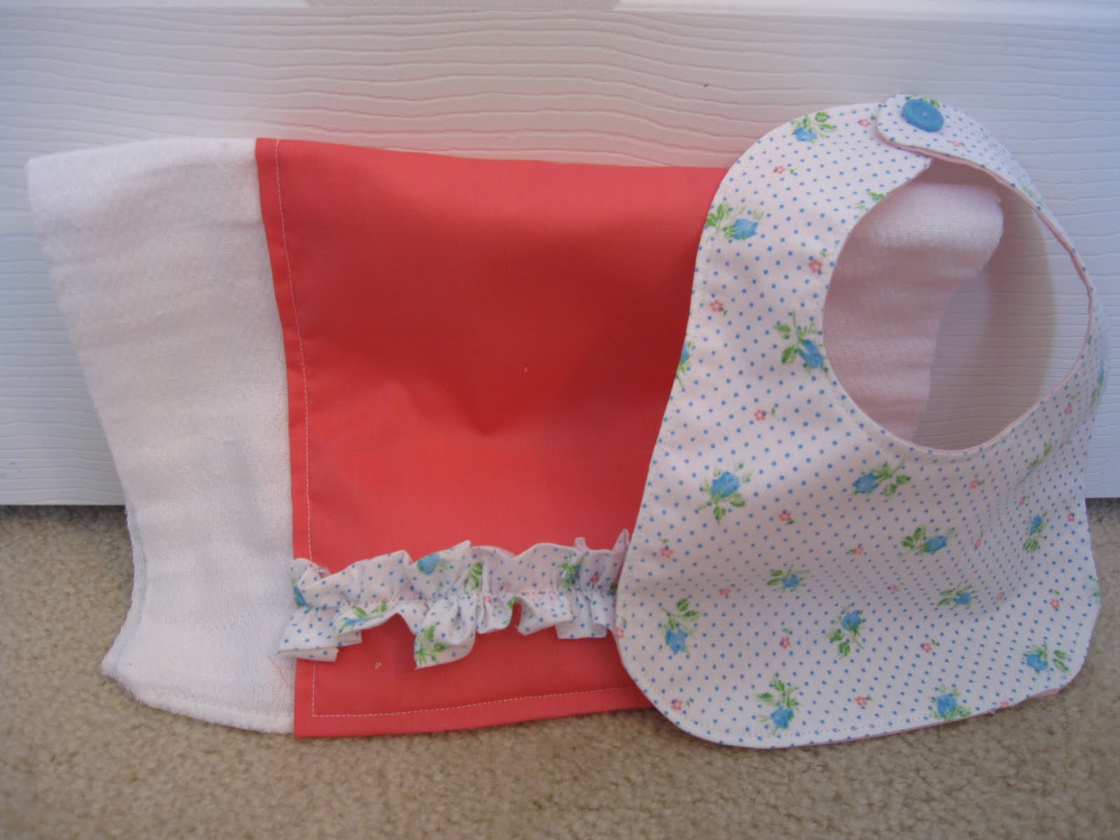 I also made some bib and burp cloth sets. I just drew the pattern for the bibs and then used store bought cloth diapers with fabric for the burp cloths. I hope they will enjoy them.